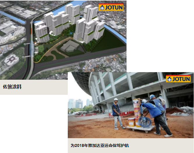 【概要描述】第十八屆亞運會將於2018年8月18日至2018年9月2日在印尼雅加達和巨港舉辦。來自45個參賽國約1萬名運動員將聚集以此,參加此次賽事。佐敦,以卓越的塗料產品、高性能的解決方案,為亞運會場館設施保駕護航! 此次中標項目包括格羅拉蓬卡諾國家體育場、10幢亞運村公寓大廈等亞運會設施。作為全球領先的塗料供應商,佐敦為此次亞運會設施提供包括裝飾漆、工業保護塗料、粉末塗料在內的"一站式解決方案"。